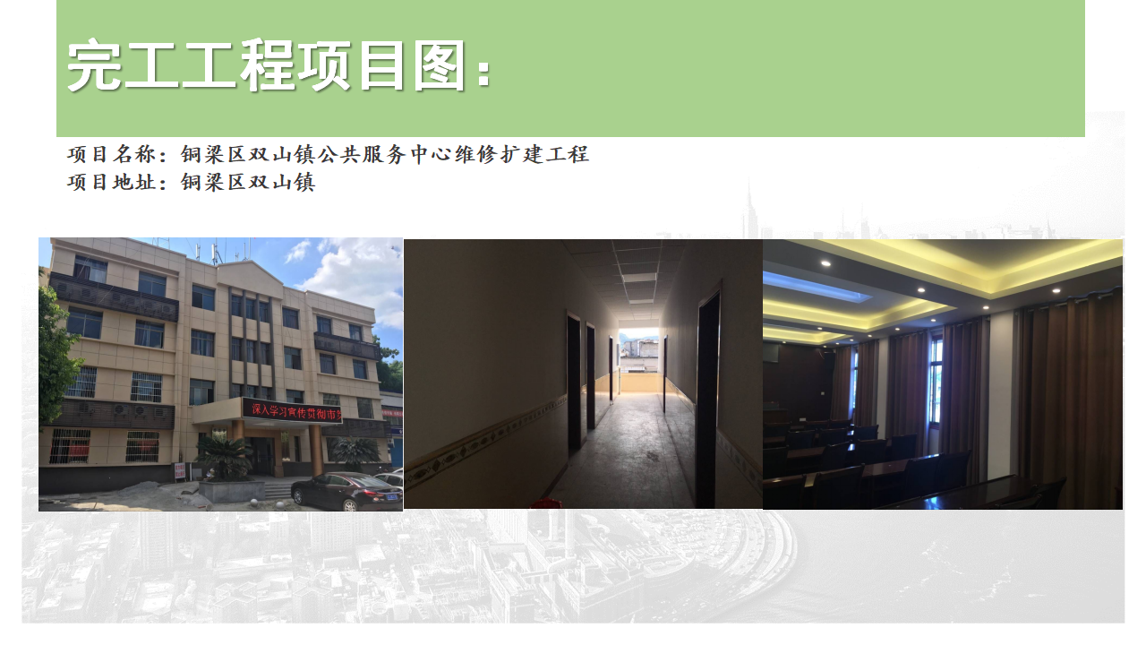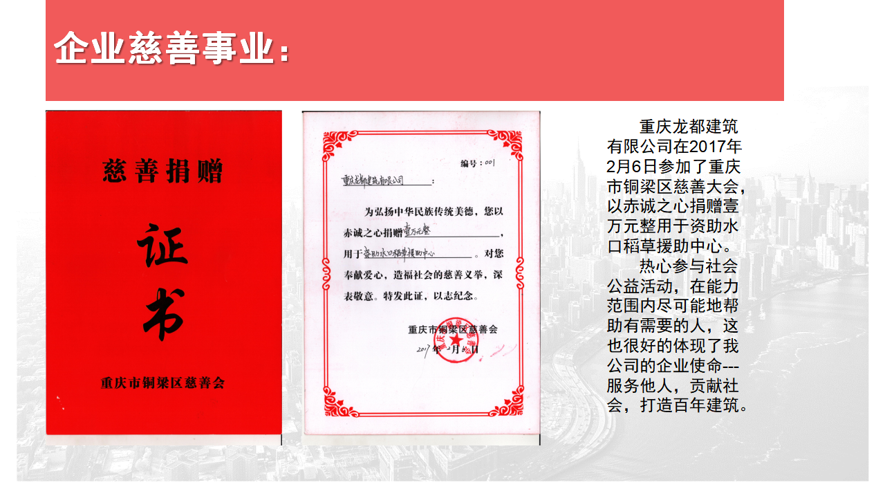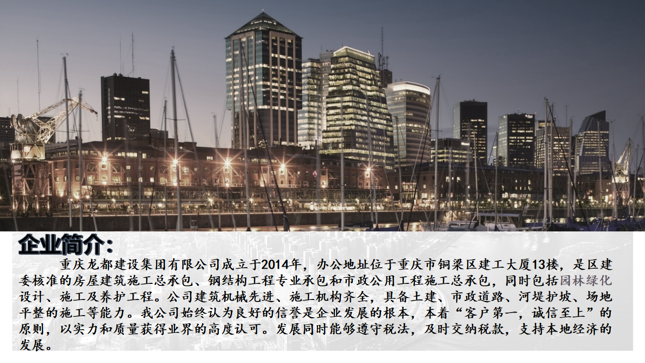 楼,是区建委核准的房屋建筑施工总承包、钢结构工程专业承包和市政公用工程施工总承包,同时包括园林绿化设计、施工及养护工程。公司建筑机械先进、施工机构齐全,具备土建、市政道路、河堤护坡、场地平整的施工等能力。我公司始终认为良好的信誉是企业发展的根本,本着
