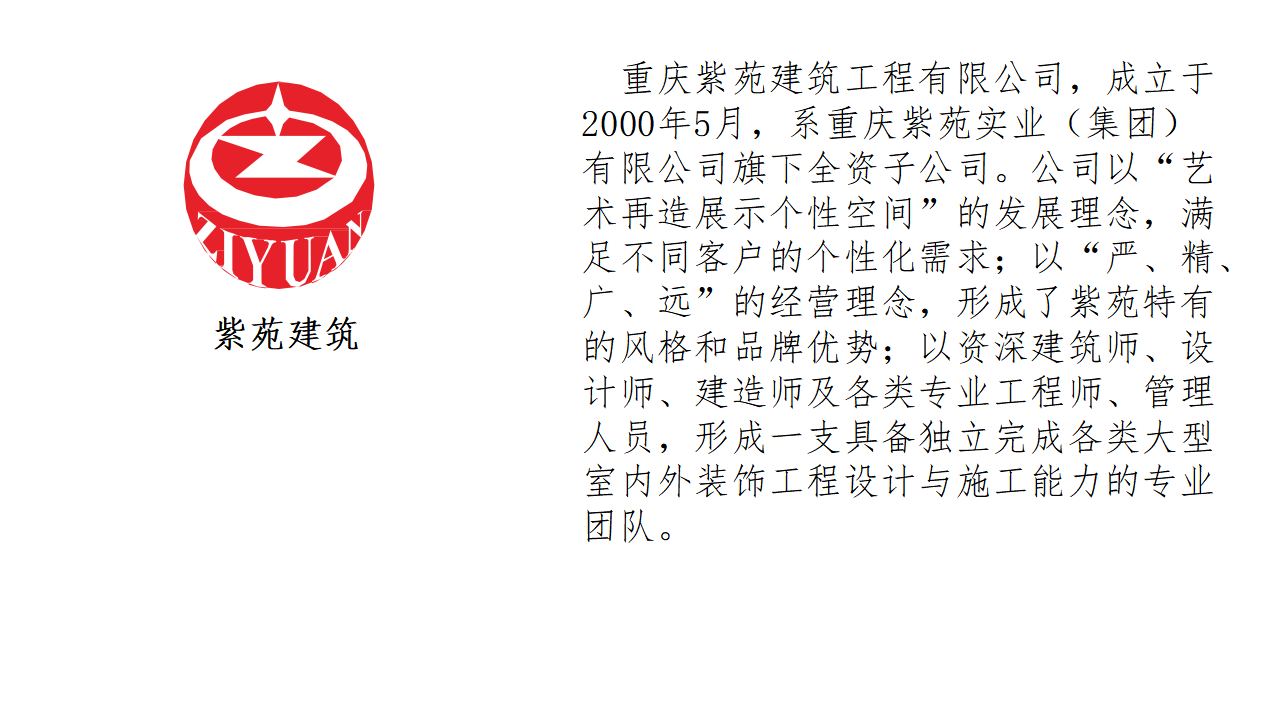 重庆紫苑建筑工程有限公司,成立于2000年5月,系重庆紫苑实业(集团)有限公司旗下全资子公司。公司以“艺术再造展示个性空间”的发展理念,满足不同客户的个性化需求;以“严、精、广、远”的经营理念,形成了紫苑特有的风格和品牌优势;以资深建筑师、设计师、建造师及各类专业工程师、管理人员,形成一支具备独立完成各类大型室内外装饰工程设计与施工能力的专业团队